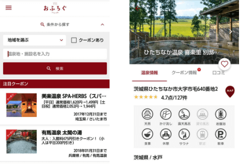 温泉やスーパー銭湯等の温浴施設や、クチコミ情報、お得なクーポンを検索できるアプリです。地図から近くの温浴施設を探すことや、泉質やこだわり条件を指定してお好みの温泉を探すことができます。また、温泉体験レポート等のまとめ記事を読むこともできます。